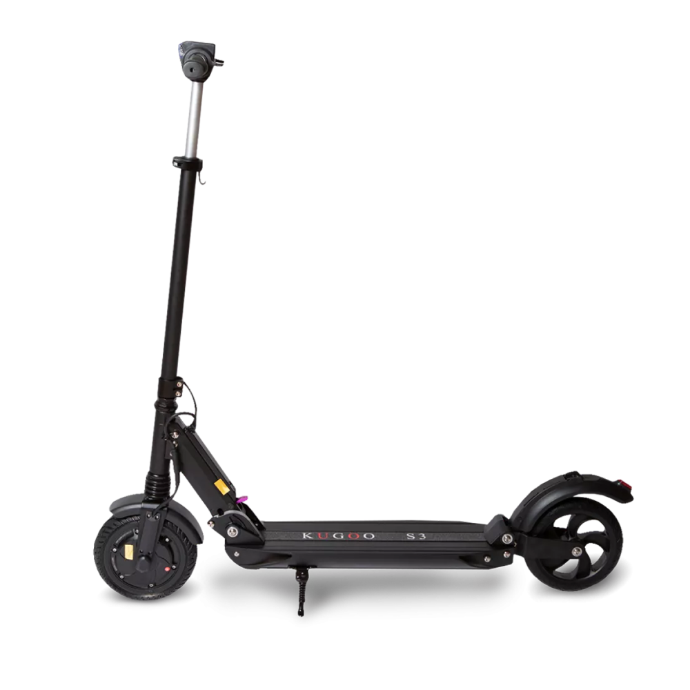 Самокат Kugoo S3 имеет запатентованную складную конструкцию, в сложенном состоянии его легко транспортировать. Его вес 11 кг позволяет переносить агрегат в руках и брать в общественный транспорт. Есть бортовой компьютер, светодиодная фара.