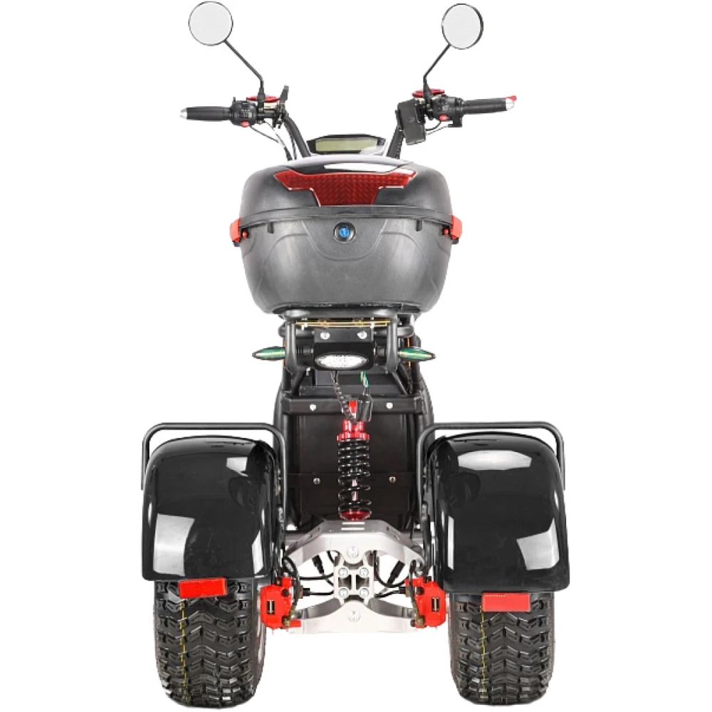 Трехколесный вариант электроскутера оснащен большими устойчивыми колесами, широким мягким сиденьем и вместительной кофрой. Техника оснащена всем необходимым для активного время провождения, поездки на рыбалку или другой вид отдыха.